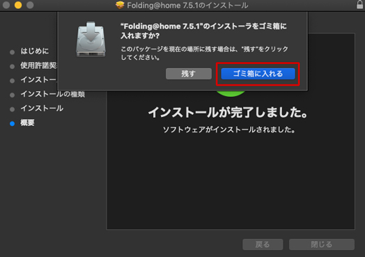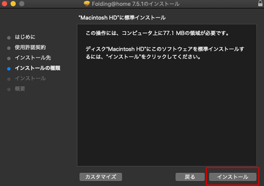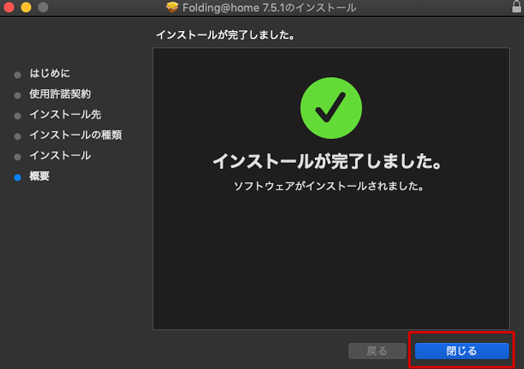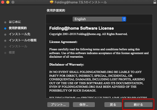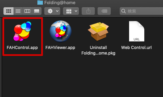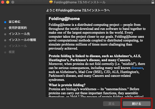 ダウンロードしたzipファイルを解凍して、pkgファイルをダブルクリックするとインストーラーが起動します。以下画像を参考に進んでMacの アプリケーションフォルダ に Folding@home というフォルダがあればインストールは成功です。個人名やチームの設定を入れるには FAHControl.app を起動させます。Viewerボタンで解析中のタンパク質のモデル構造が表示されます。